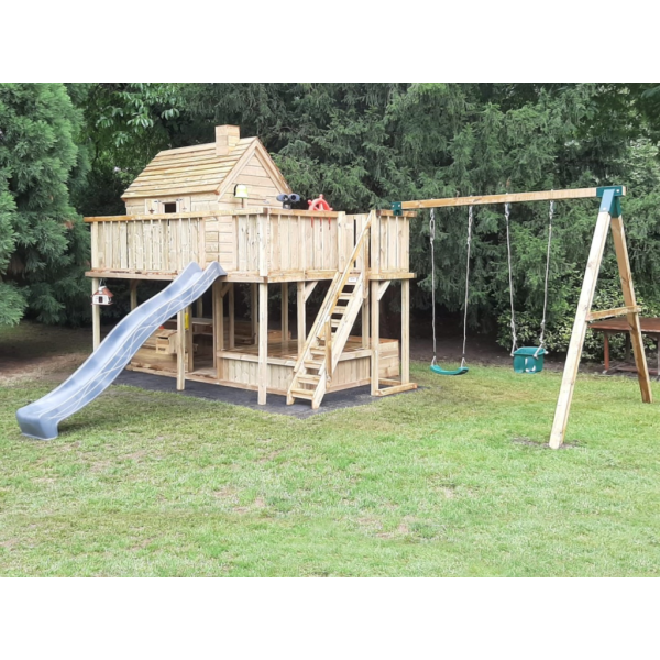 Although all wooden parts are pressure-treated, the wood remains sensitive to (excessive) moisture. We therefore advise a stony substrate. If the play equipment is to be placed on the lawn (or other moist substrate), we recommend creating a platform of concrete tiles the size of the play equipment. A number of tiles under the bearing points of the play equipment may also be sufficient. Make sure the substrate is level!