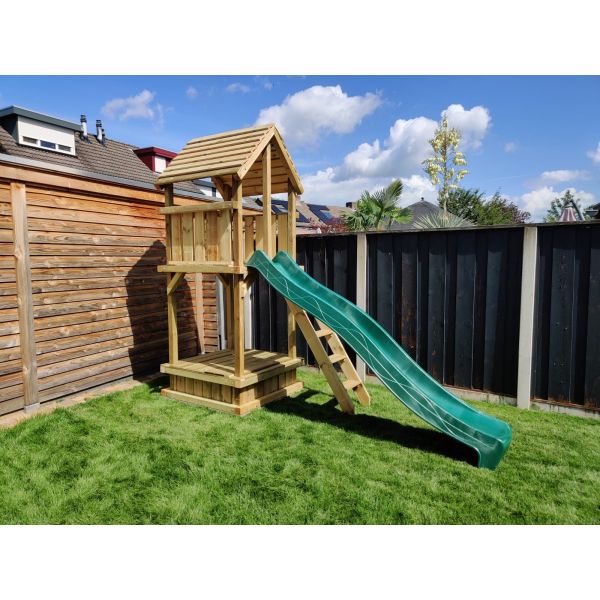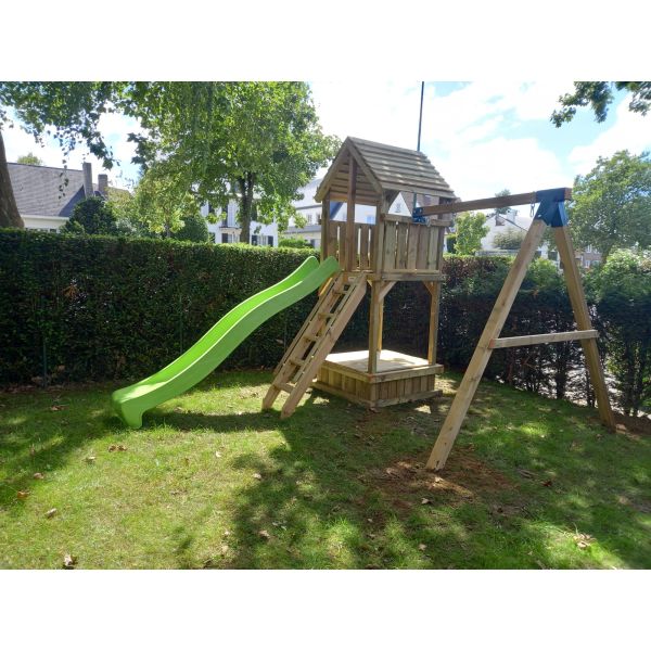 Although all wooden parts are pressure-treated, the wood remains sensitive to (excessive) moisture. We therefore advise a stony substrate. If the play equipment is to be placed on the lawn (or other moist substrate), we recommend creating a platform of concrete tiles the size of the play equipment. A number of tiles under the bearing points of the play equipment may also be sufficient. Make sure the substrate is level!