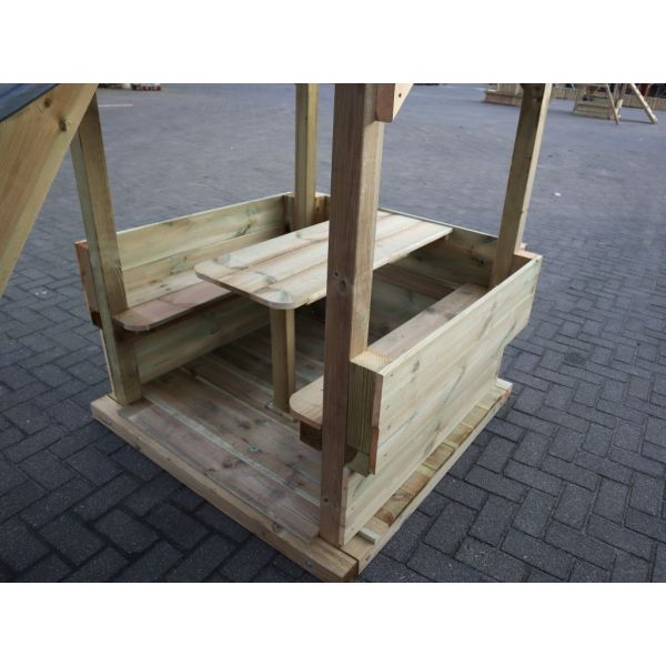Although all wooden parts are pressure-treated, the wood remains sensitive to (excessive) moisture. We therefore advise a stony substrate. If the play equipment is to be placed on the lawn (or other moist substrate), we recommend creating a platform of concrete tiles the size of the play equipment. A number of tiles under the bearing points of the play equipment may also be sufficient. Make sure the substrate is level!