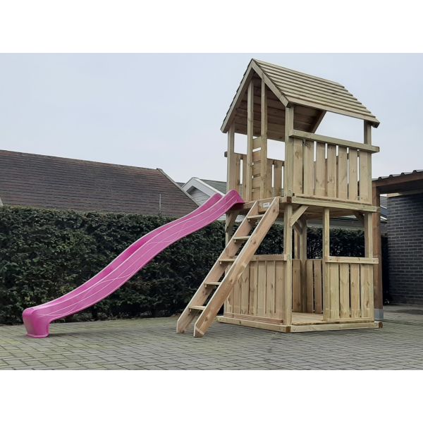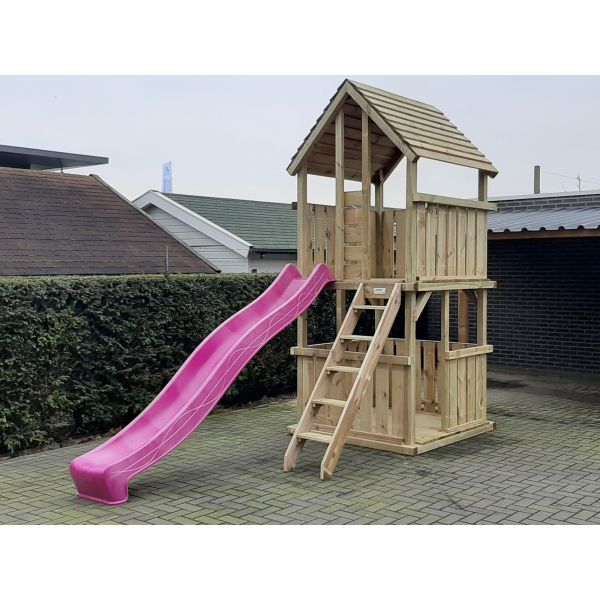 The dimensions of the play tower are 150cm x 150cm. The slide height is 150cm. From here, there is a 300cm long slide, available in 8 different colors.