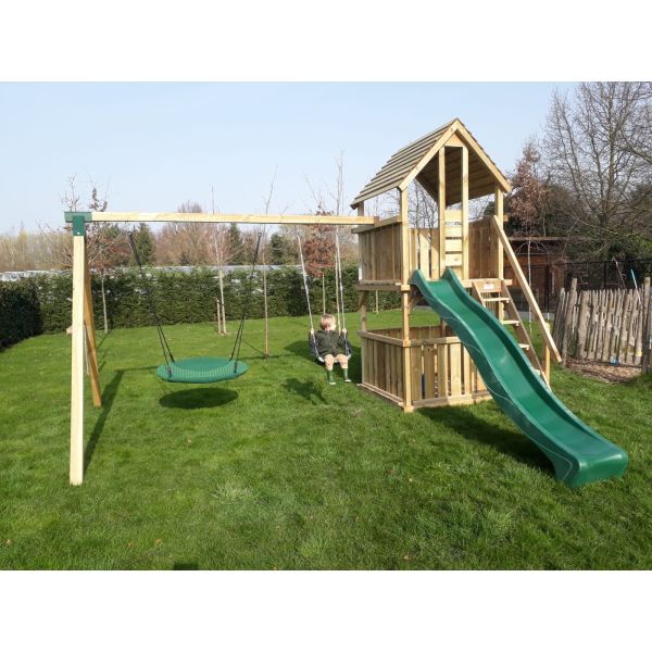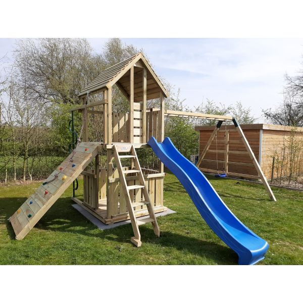 You can customize the play tower with additional parts (attachment swing, climbing wall, etc.) or extras (e.g., guardrail, market stand, storrage box, ect.). Don't forget to order the swing seats and accessories!
