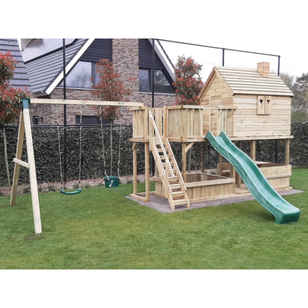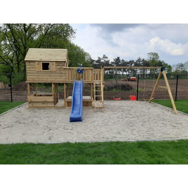 Although all wooden parts are pressure-treated, the wood remains sensitive to (excessive) moisture. We therefore advise a stony substrate. If the play equipment is to be placed on the lawn (or other moist substrate), we recommend creating a platform of concrete tiles the size of the play equipment. A number of tiles under the bearing points of the play equipment may also be sufficient. Make sure the substrate is level!