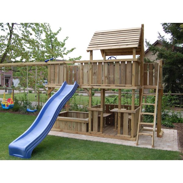 The play tower 360 is designed in a way that provides the option to attach a swing and climbing ramp.