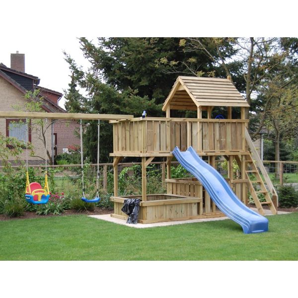 You can customize the play tower with additional parts (attachment swing, climbing wall, etc.) or extras (e.g., guardrail, market stand, storrage box, ect.). Don't forget to order the swing seats and accessories!