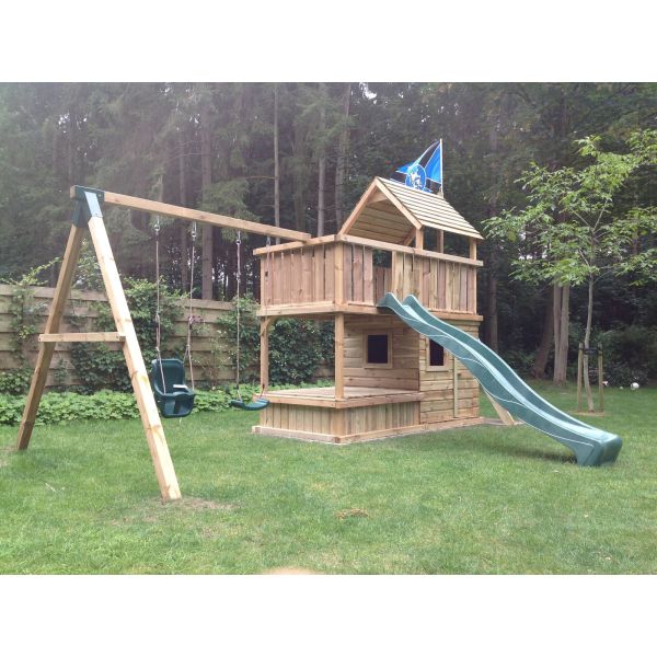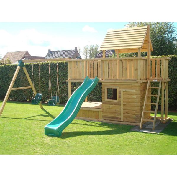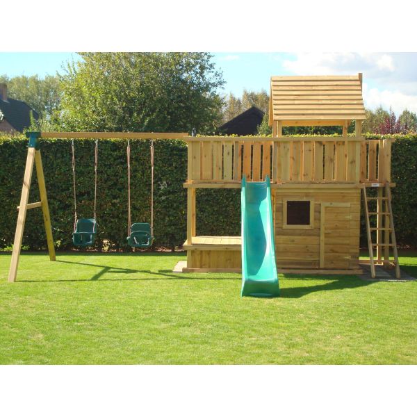 You can customize the play tower with additional parts (attachment swing, climbing wall, etc.) or extras (e.g., guardrail, market stand, storrage box, ect.). Don't forget to order the swing seats and accessories!