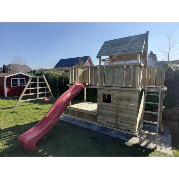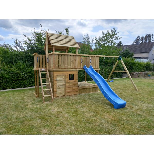 The dimensions of the climbing structure are 360cm x 148cm x 330cm (L x W x H). The slide height of the play tower is 150cm. From here, there is a 3m long slide, available in many colors.