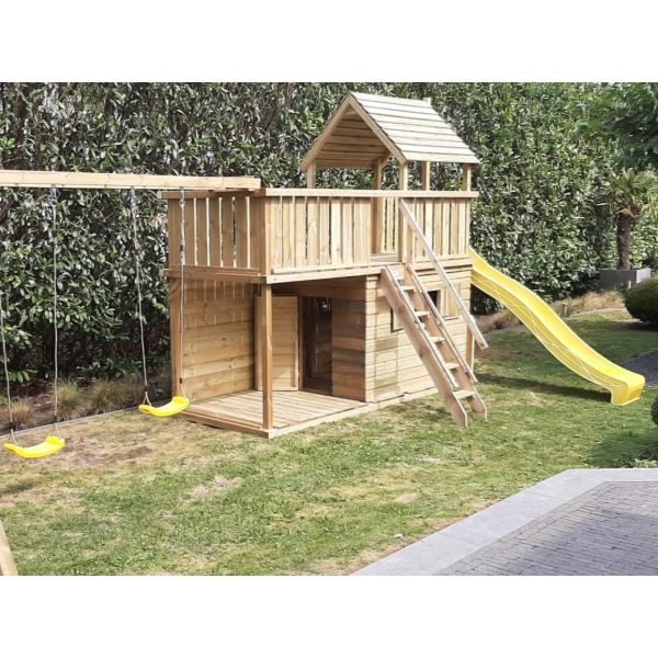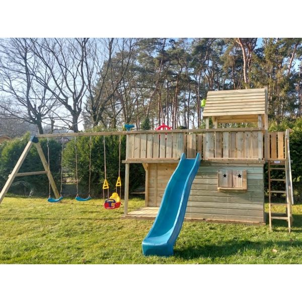 You can customize the play tower with additional parts (attachment swing, climbing wall, etc.) or extras (e.g., guardrail, market stand, storrage box, ect.). Don't forget to order the swing seats and accessories!