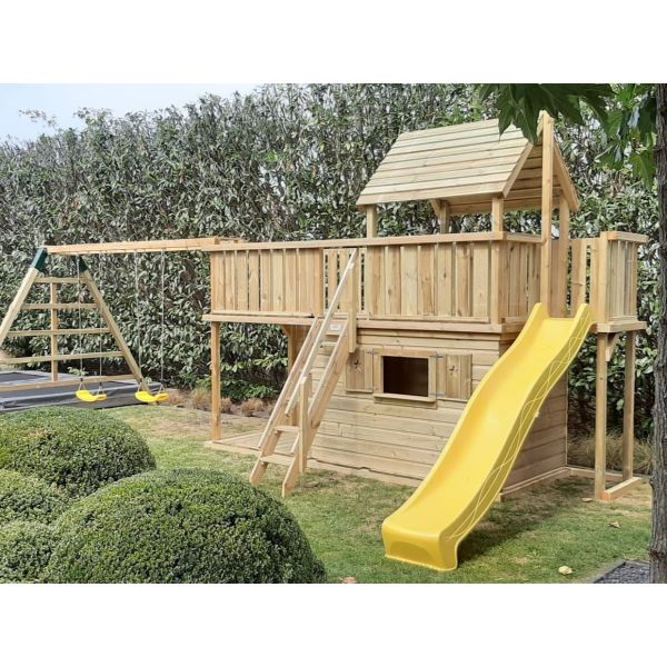 The dimensions of the climbing structure are 424cm x 148cm x 330cm (L x W x H). The platform of the play tower is 150 cm high. From here, there is a 3 meter long slide, available in many colors.