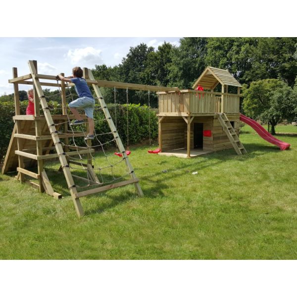 This climbing structure features two different modules at the bottom, a large playhouse and a terrace with a back wall.