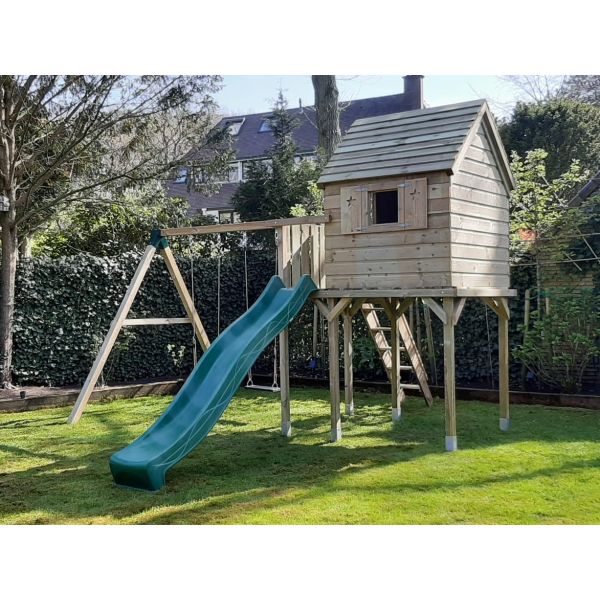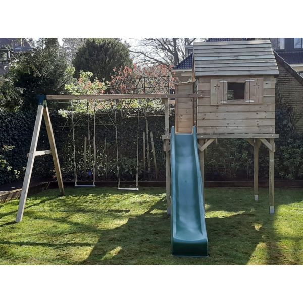 The dimensions of the play tower are 212cm x 148cm. The slide height of the tower is 150cm. From here, there is a 300cm long slide, available in many different colors. The total height of the play tower is 330cm.