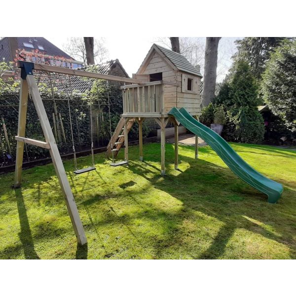 You can customize the play tower with additional parts (attachment swing, climbing wall, etc.) or extras (e.g., guardrail, market stand, storrage box, ect.). Don't forget to order the swing seats and accessories!
