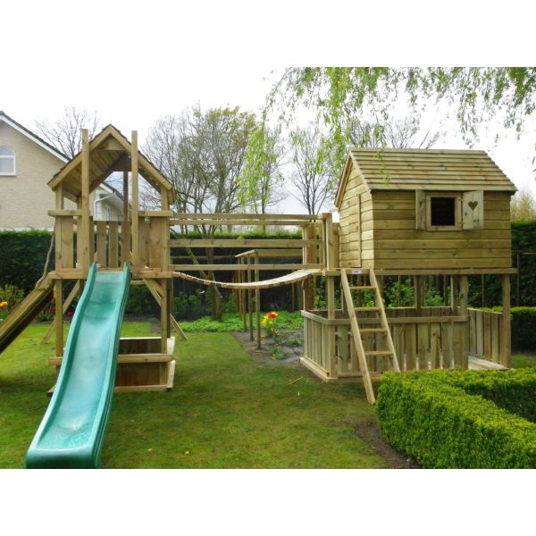 Although all wooden parts are pressure-treated, the wood remains sensitive to (excessive) moisture. We therefore advise a stony substrate. If the play equipment is to be placed on the lawn (or other moist substrate), we recommend creating a platform of concrete tiles the size of the play equipment. A number of tiles under the bearing points of the play equipment may also be sufficient. Make sure the substrate is level!