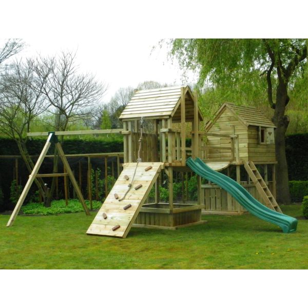 Hoewel alle houten onderdelen onder hoge druk geïmpregneerd zijn, blijft het hout gevoelig voor (overmatig) vocht. Wij adviseren derhalve een steenachtige ondergrond. Wanneer het speeltoestel op het gazon (of andere vochtige ondergrond) komt te staan, raden wij aan een plateau van betontegels aan te leggen ter grootte van het speeltoestel. Een aantal tegels onder de dragende punten het speeltoestel zijn eventueel ook voldoende. Zorg hierbij dat de ondergrond waterpas is!