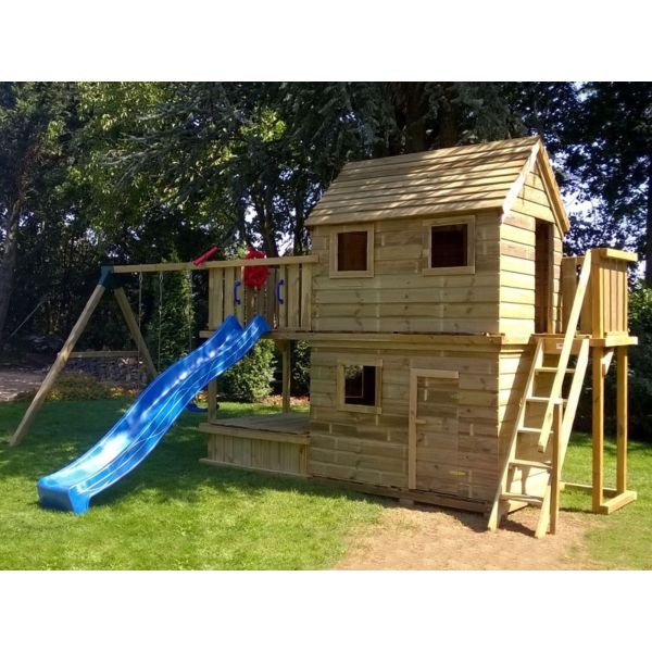 The dimensions of the play tower are 424cm x 148cm x 330cm (L x W x H). The platform of the play tower is 150cm high. From here, there is a 3m long slide, available in many colors.