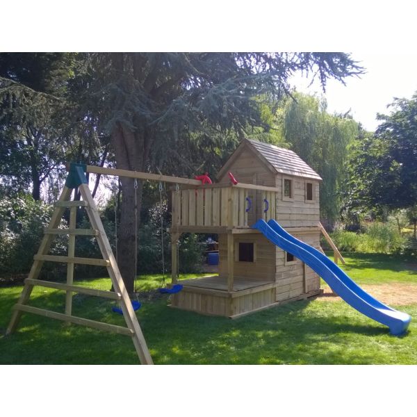 You can customize the play tower with additional parts (attachment swing, climbing wall, etc.) or extras (e.g., guardrail, market stand, storrage box, ect.). Don't forget to order the swing seats and accessories!