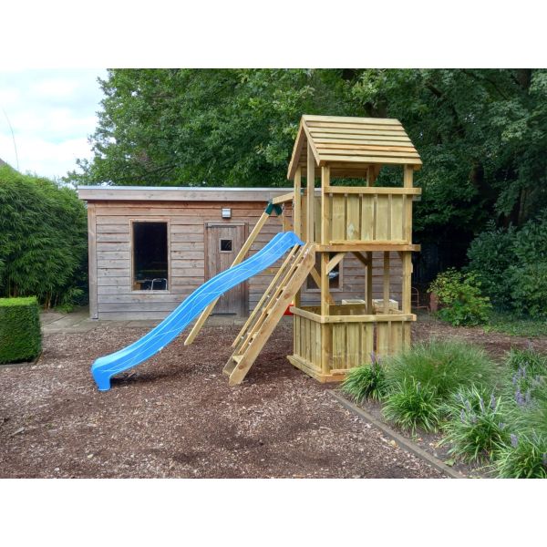 De speeltoren heeft een houten vloer waarlangs een hekwerk gemonteerd kan worden. De positie van dit hekwerk, met name de ingang, kan naar eigen inzicht gemonteerd worden.