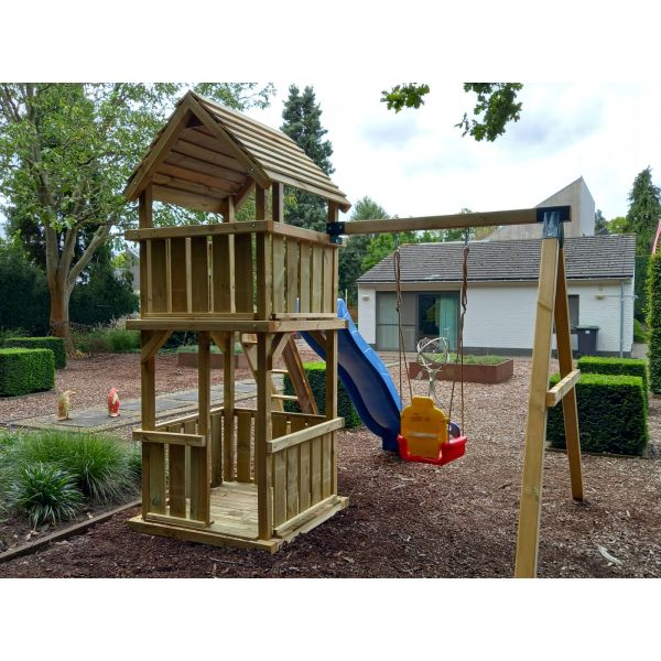 Je kunt zelf het speeltoestel uitbreiden met extra onderdelen (aanbouwschommel, klimwand etc.) of extra's (trapleuning, marktkraam etc.). Vergeet niet de schommelzitjes en enkele leuke accessoires mee te bestellen!