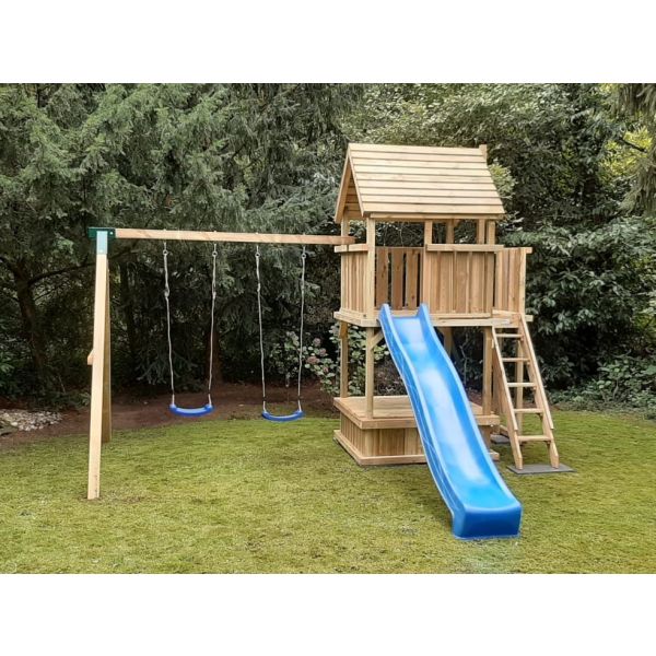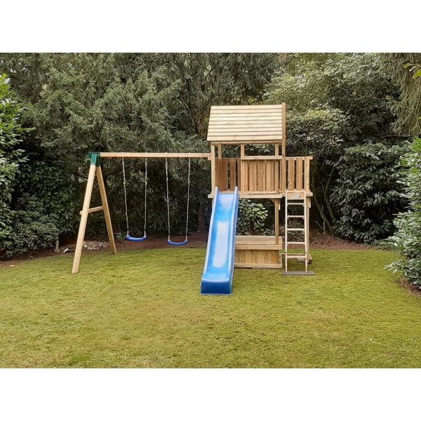 Het speeltoestel is geschikt om uit te breiden met een aanbouwschommel, klimwand of brandweer glijstang.