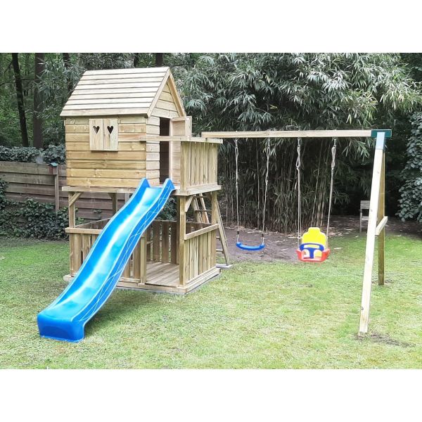 Je kunt zelf het speeltoestel uitbreiden met extra onderdelen (aanbouwschommel, klimwand etc.) of extra's (trapleuning, deur, luikjes, marktkraam, etc.). Vergeet niet de schommelzitjes en enkele leuke accessoires mee te bestellen!