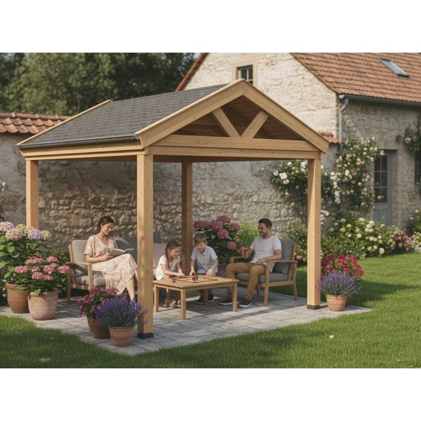 Robuust tuinhuis met spits dak van onbehandeld douglashout.